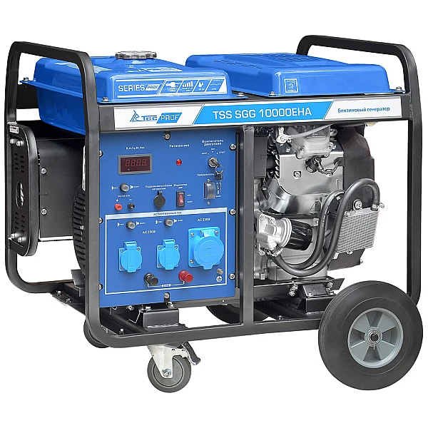 Бензиновый генератор TSS SGG 10000EHA - мощная 10-киловаттная электростанция, которая позволяет реализовать различные варианты подключения нагрузки и отличается высокой мобильностью за счет колесного комплекта. Благодаря совместимости с блоками автоматики установку можно использовать в качестве резервного источника электроэнергии, который будет автоматически обеспечивать питание дома или коммерческого объекта при отключении электричества в сети.
