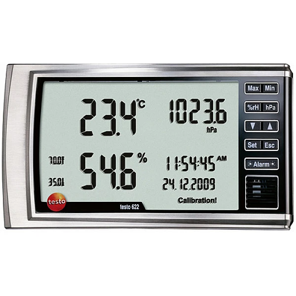Одним из основных преимуществ термогигрометра Testo 622 является высокая информативность. Помимо измеряемых показателей влажности, температуры и барометрического давления на крупном цифровом дисплее отображается текущее время и дата. Вы можете разместить прибор в любом месте, удобном для наблюдения за его показаниями – на столе или на стене, используя для этого соответствующее крепление. По вашему выбору, измеряемые величины могут отображаться в разных системах единиц, чем обеспечивается универсальность данной модели.