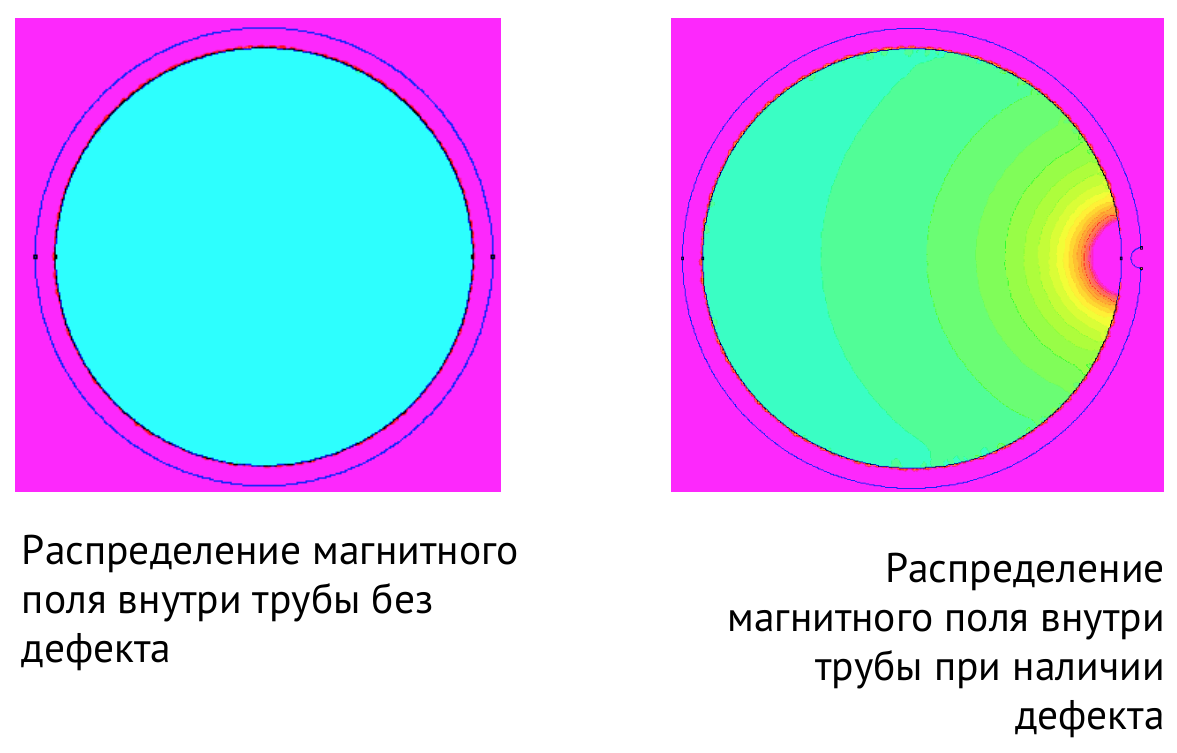Диагностический робот перемещается внутри трубопровода, производя сканирование 100% площади трубы. Датчики выявляют аномалии магнитного поля в местах дефектов. Используя специальный алгоритм, программа определяет остаточную толщину металла.