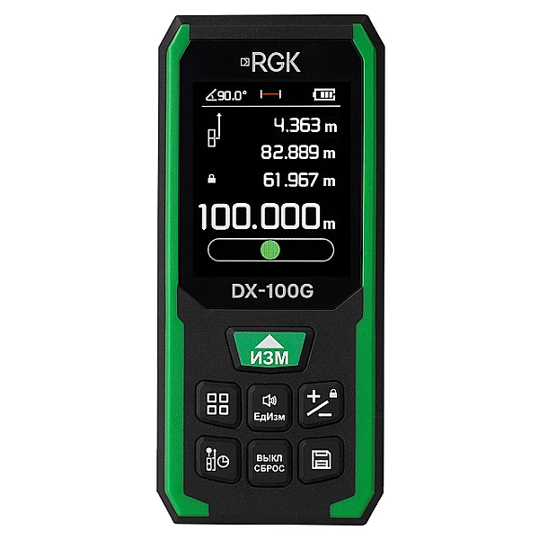 Лазерный дальномер RGK DX-100G – профессиональный измерительный инструмент строительного назначения, предназначенный для использования на дистанциях до 100 м, с помощью которого можно выполнять обмеры участков, строений и прочих объектов. Прибор оборудован зеленым излучателем, упрощающим выполнение работ на ярком солнце – за счет хорошей различимости маркера, используемого для визуального наведения, а встроенный инклинометр позволяет контролировать величину вертикальных углов и производить выравнивание. К преимуществам изделия относится наличие цветного графического дисплея, обеспечивающего высокую наглядность и информативность, а также аккумуляторного питания с подзарядкой через USB Type-C, за счет чего инструмент отличается экономичностью, не нуждаясь в замене батареек.