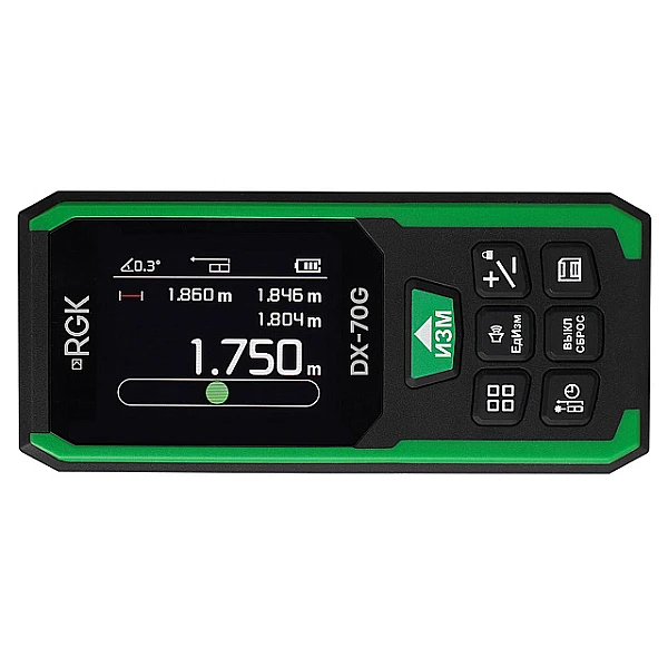 Строительный лазерный дальномер RGK DX-70G, помимо стандартных для своего класса инструментов режимов, обеспечивающих определение площадей, объемов, выполнение косвенных измерений и простых вычислений, дополнительно реализует функцию разметки и электронного пузырькового уровня. Показания автоматически сохраняются во внутренней памяти на 100 ячеек, которая циклически перезаписывается после полного заполнения.