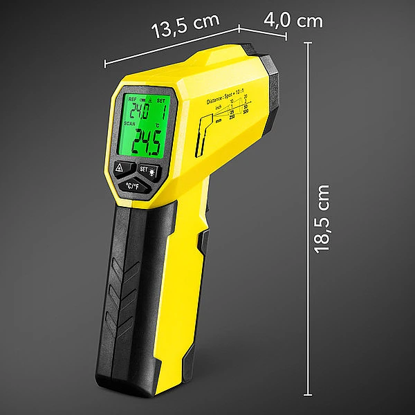 Мониторинг температуры поверхности электрических устройств, двигателей, систем охлаждения или стен является важной задачей при оценке энергоэффективности. Непрерывное измерение температуры часто позволяет избежать больших повреждений и дорогостоящих восстановительных работ. Поскольку не нужно прикасаться к поверхностям, которые могут быть слишком горячими или холодными, пользователь будет в безопасности при проведении измерений инфракрасным методом. Trotec BP17 надежный и точный пирометр для измерения температуры поверхности. Его инфракрасный датчик позволяет измерять температуру в широком диапазоне от -50 °C до +380 °C. Вы можете заранее определить эталонную температуру, а возможные отклонения можно указать и затем контролировать с помощью визуальных и акустических сигналов тревоги. При настройке диапазона допуска вы можете выбрать между 1°C, 3°C и 5°C. Прибор оснащен лазерным целеуказателем который указывает центр измеряемого пятна поверхности (оптическое разрешение 10:1). Большой дисплей с подсветкой гарантирует превосходный обзор измеренных значений даже при плохом освещении, а современный эргономичный дизайн с удобной рукояткой обеспечивает удобное управление. Когда устройство не используется, оно автоматически отключается, таким образом, снижает и так низкое энергопотребление. С помощью удобной сумки на ремне можно удобно носить пирометр и всегда иметь его под рукой.