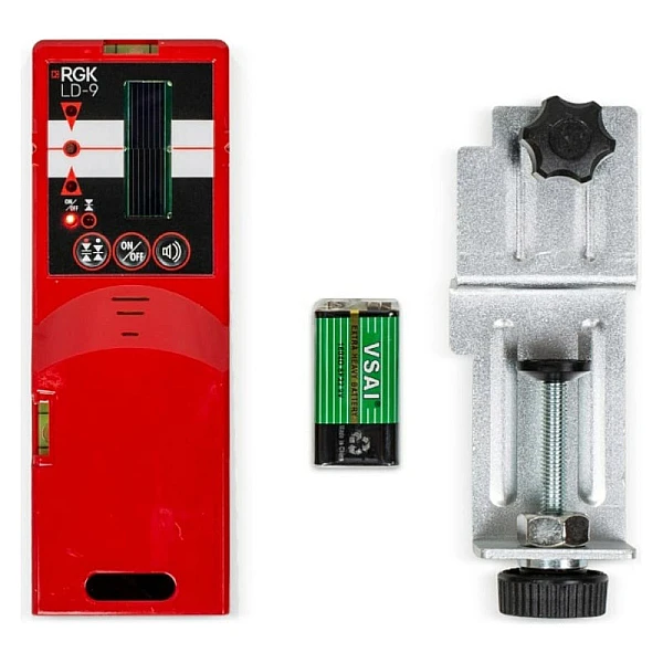 Универсальный приемник излучения RGK LD-9 с односторонним дисплеем для лазерных нивелиров (построителей плоскости) позволяет работать с приборами, когда лазерная плоскость невидима, а также служит для увеличения рабочего диапазона лазерных нивелиров до 50-70 м. Работает с красным и зеленым цветами лазеров.
